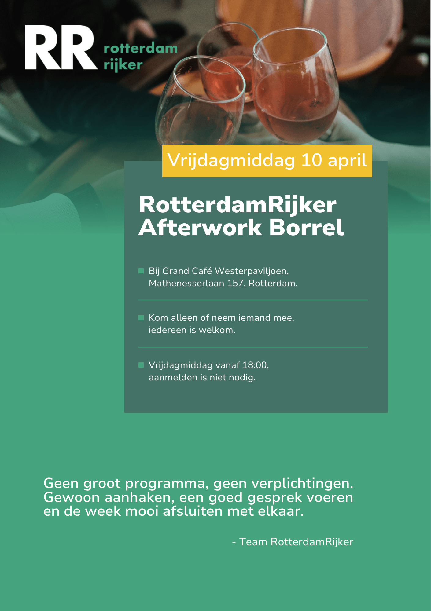 Op vrijdag 10 april openen we de deuren van Grand Café Westerpaviljoen voor een informele borrel met iedereen die zich thuis voelt in de wereld van RotterdamRijker. Geen programma, geen agenda, geen verplichtingen. Gewoon samenkomen, een goed gesprek voeren en nieuwe gezichten ontmoeten in een van de mooiste cafés van de stad.